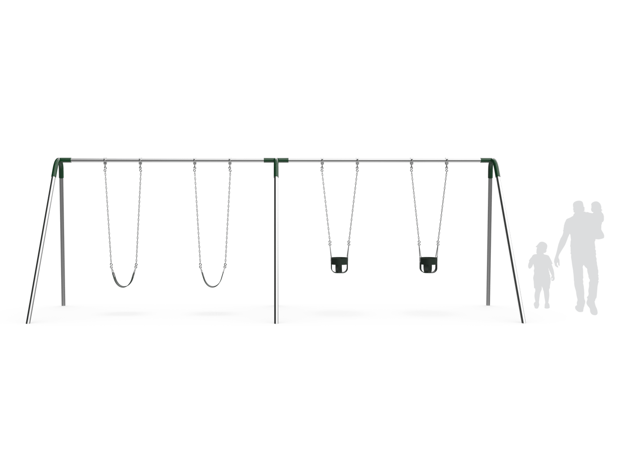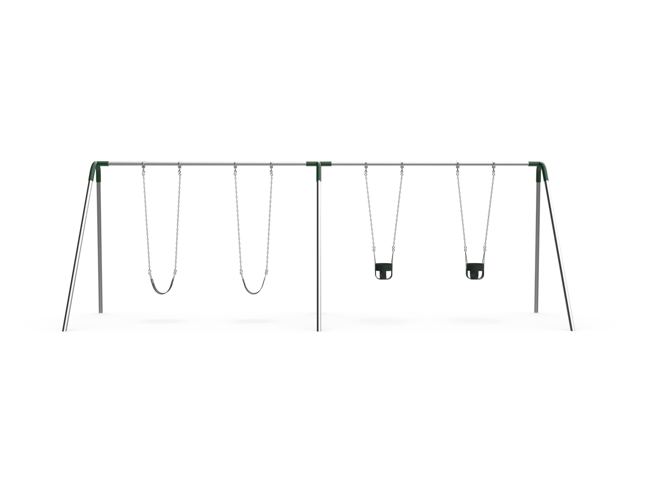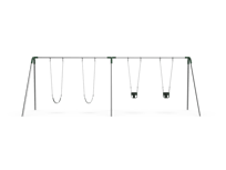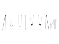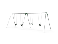 The Bipod Swings feature a 8' high double bay frame with 2-3/8" galvanized pipe top rail and 2-3/8" diameter legs. Powder coated blue (BLU) or green (GRN) yoke connectors. Seats, swing hangers, chain and factory-closed S-hooks included with swing sets.