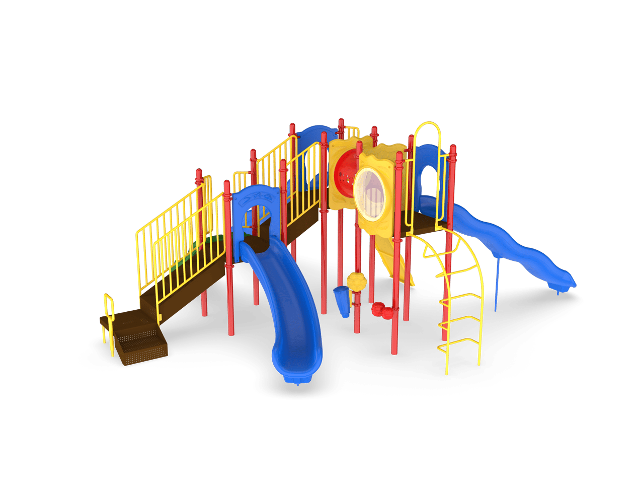 Boulder Point meets ADA guidelines and is commercially compliant with ASTM & CSPC. The posts are 13-gauge galvanized steel tube and powdercoated. The plastics are heavy-duty rotomolded & blow molded components. Critical fall height is 6’.