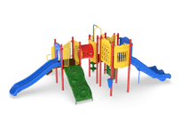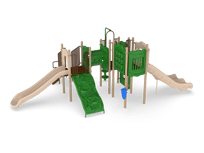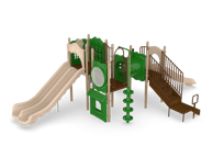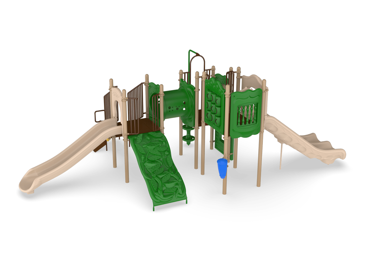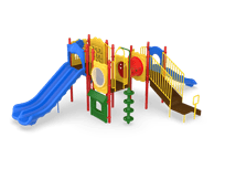 Carsons Canyon is a great choice for a busy park, large apartment complex or church. It offers two slides including a Double Slide. The Game, Window and Ships Wheel Panels add sensory play while on the structure and the Bass Drum and Rain Wheel provide music and sensory play at ground level. The Store Panel encourages children to engage in dramatic play. Additionally, the Vine and Beanstalk Climbers encourage children to use upper and lower body strength while developing important motor skills.