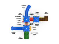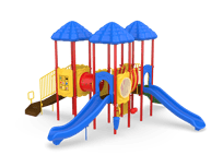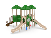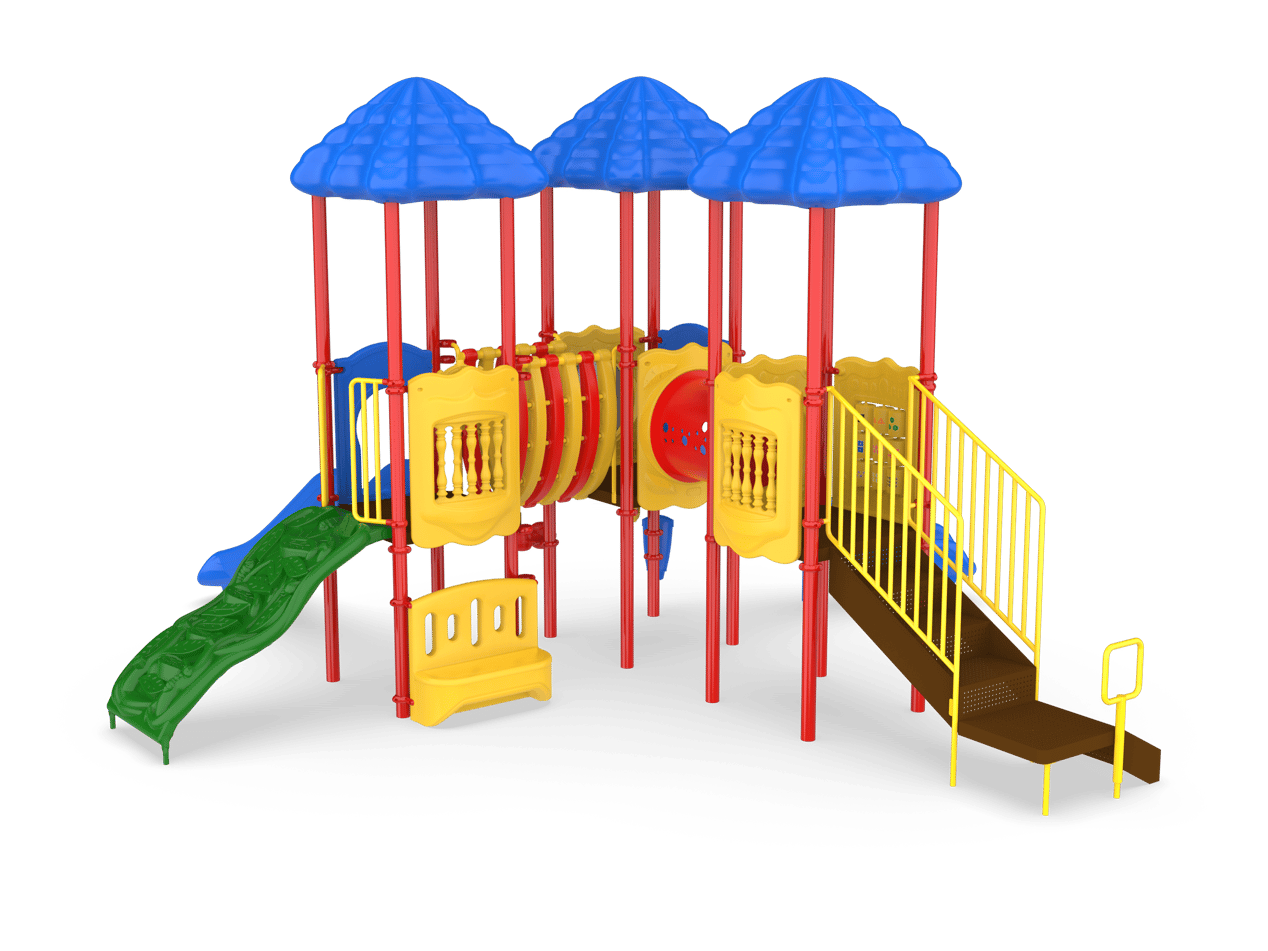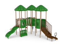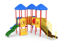 The Cumberland Gap is the gateway to fun! Boasting three decks, this exciting structure can accommodate a high traffic park or multiple classrooms. Each deck is covered with a nature-themed roof, adding shade to the entire structure. Children will traverse from deck to deck using the Bone Bridge and Crawl Tunnel before making their voyage down the straight or curved slide. A Game, Window and Ships Wheel Panel add fun play stations on the structure, while the Bass and Bongo Drums and Rain Wheel offer exciting ground level play. This structure meets ADA guidelines and is commercially compliant with ASTM & CSPC. A ground spike surface mount is included with the structure, but an anchor bolt surface mount or in-ground mounting kit can be purchased separately. Plastics: Heavy-duty rotomolded & blow molded components. Critical Fall Height: 4'0" Perfect for easy-install, commercially compliant and budget-conscious solutions for daycares, churches and apartment complexes! Assembly required. Truck delivery.