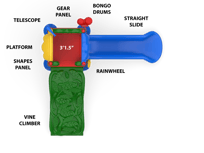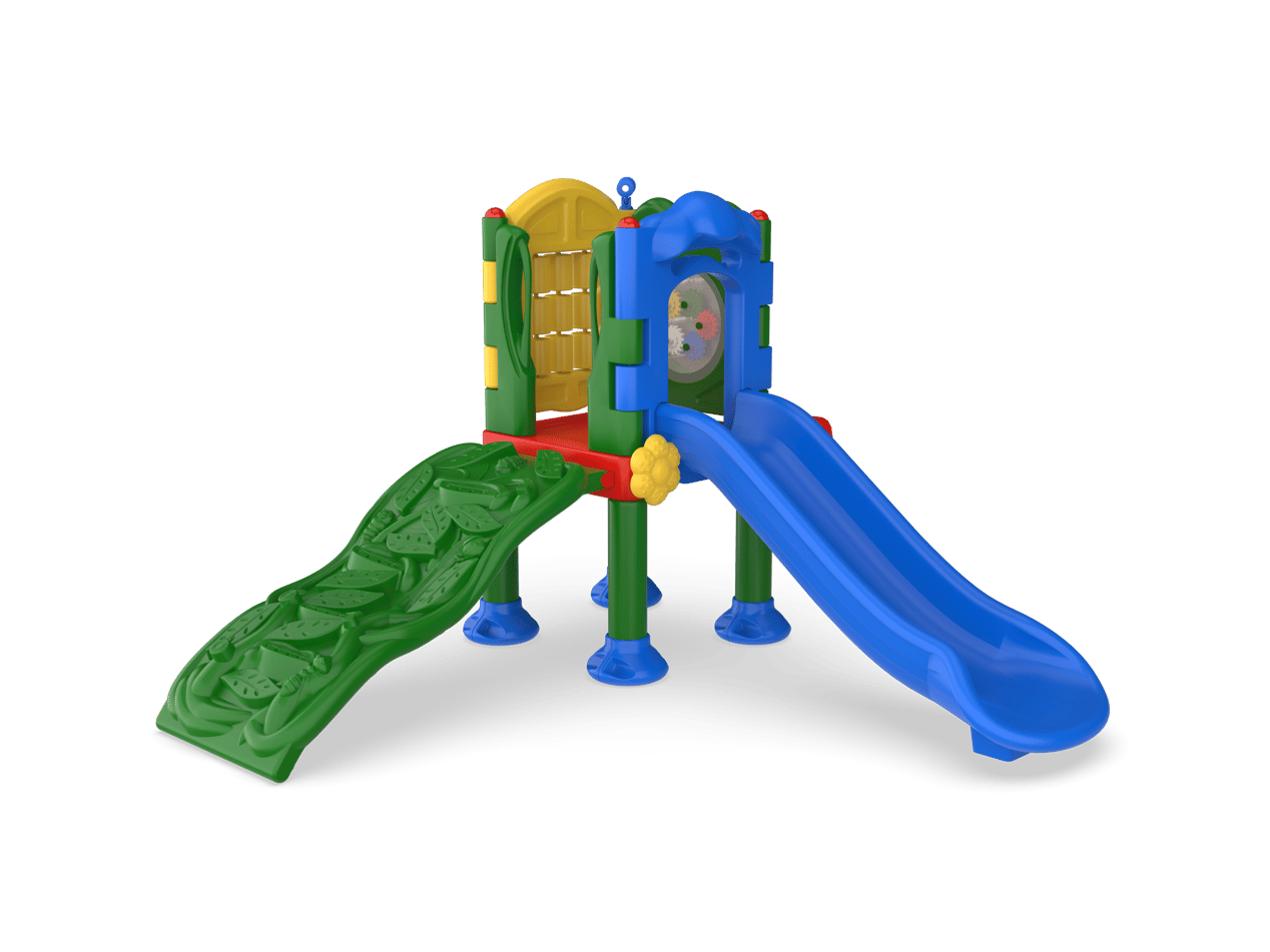 The Discovery Hilltop is a single deck design that is ideal for home early childhood centers, as it can be used indoor or outside. Children will develop object recognition as they discover lady bugs, ants, and caterpillars while they climb up the vine climber to the deck. Children can also engage in five elevated activities before they descend down the straight slide to ground level!