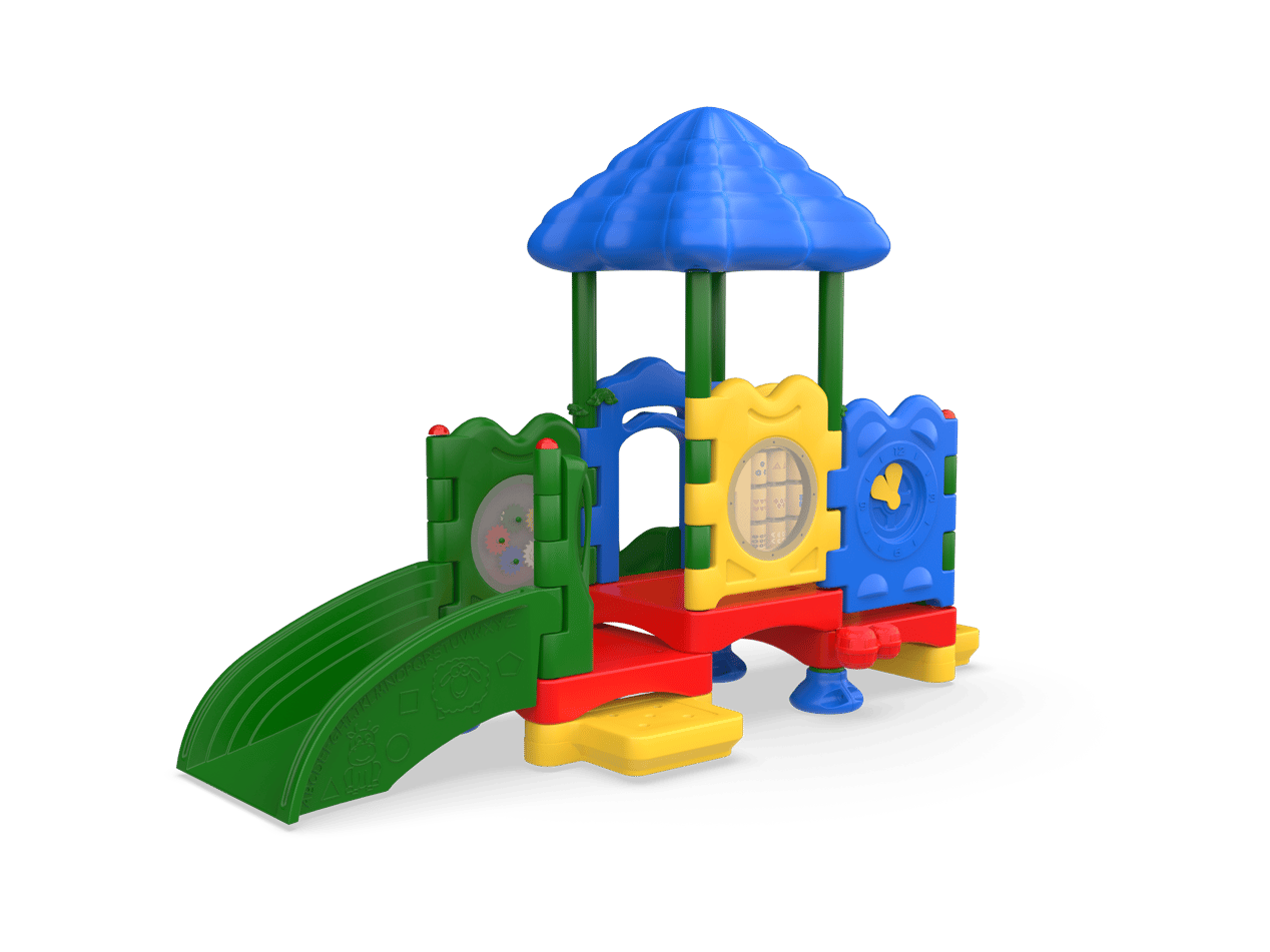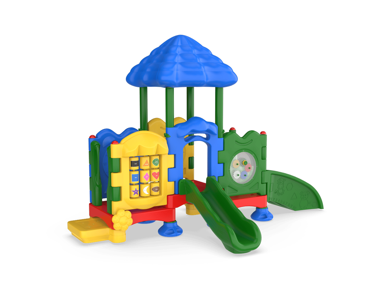 The Discovery Center Sapling is a three-deck structure designed for children ages 6-23 months. Large enough to allow 2-3 classrooms to play together, the many activities will spark imagination and encourage learning. Featuring both the multi-functional play ramp and the tot slide, the Discovery Center Sapling provides various options for children to develop motor skills and achieve developmental milestones. The play ramp features animals, shapes, ABC’s and numbers to encourage language development and counting skills. The tot slide offers a gentle thrill as children transition from the middle deck to ground level.