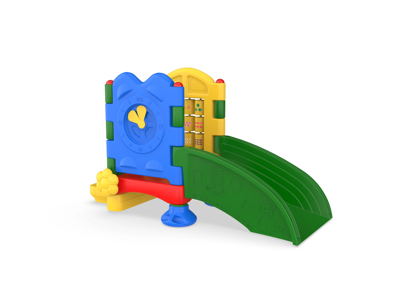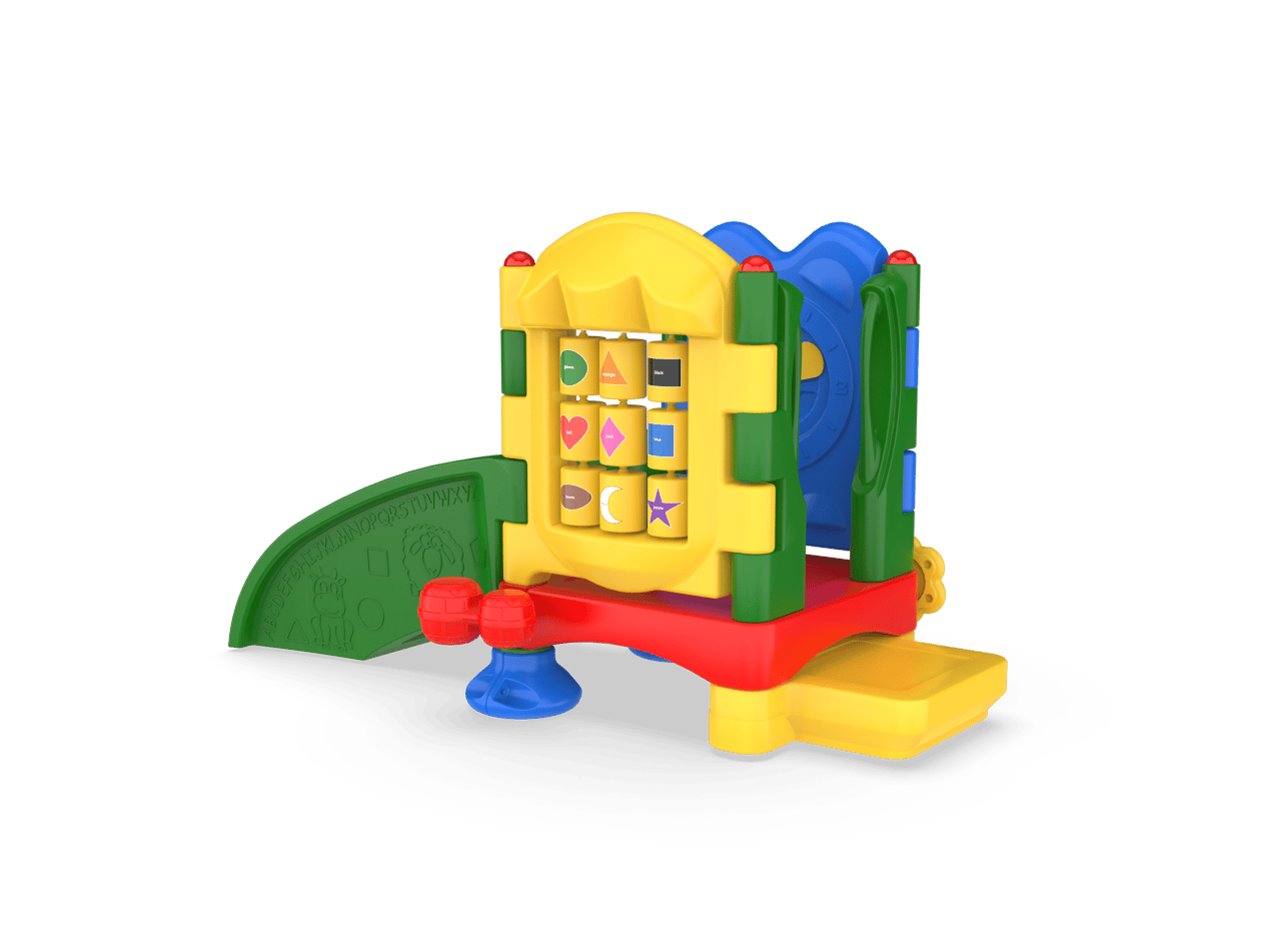 The Discovery Center Super Sprout is an ideal play solution for developing 6-23-month children! This one deck structure features a multi-functional play ramp that is designed to help infants and toddlers meet developmental milestones. The sides of the play ramp feature animals, shapes, ABC’s and numbers to promote language development and counting skills. The gentle curved design encourages the progression from crawling to walking, while the molded edge provides natural handholds for children learning to pull-up, stand, and walk. This structure is also available with a roof, which provides shade and comfort for children during play!