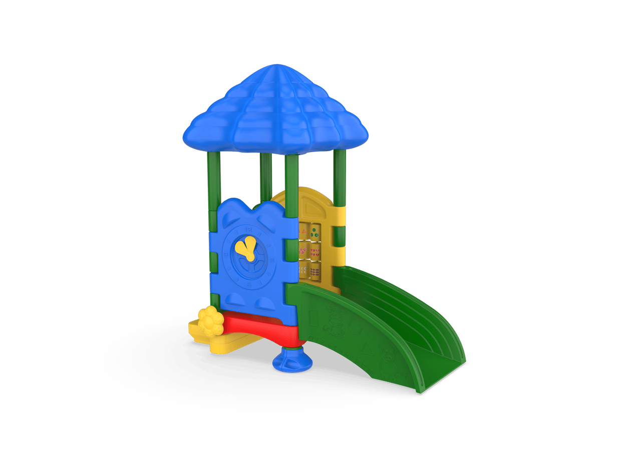 The Discovery Center Super Sprout is an ideal play solution for developing 6-23-month children! This one deck structure features a multi-functional play ramp that is designed to help infants and toddlers meet developmental milestones. The sides of the play ramp feature animals, shapes, ABC’s and numbers to promote language development and counting skills. The gentle curved design encourages the progression from crawling to walking, while the molded edge provides natural handholds for children learning to pull-up, stand, and walk. This structure features a roof which provides shade and comfort for children during play!