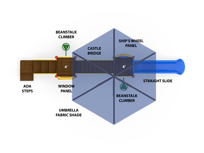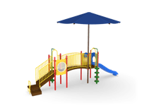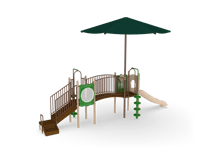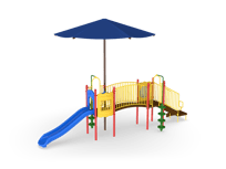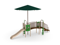 Intentionally created for narrower play spaces, the Row Series jams tons of activity into a straight line of fun! The Lafayette with Shade offers multiple climbers and play panels together with protection from the sun. The 4’ fall height makes it ideal for kids from 2-12.