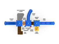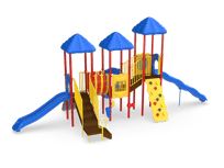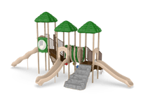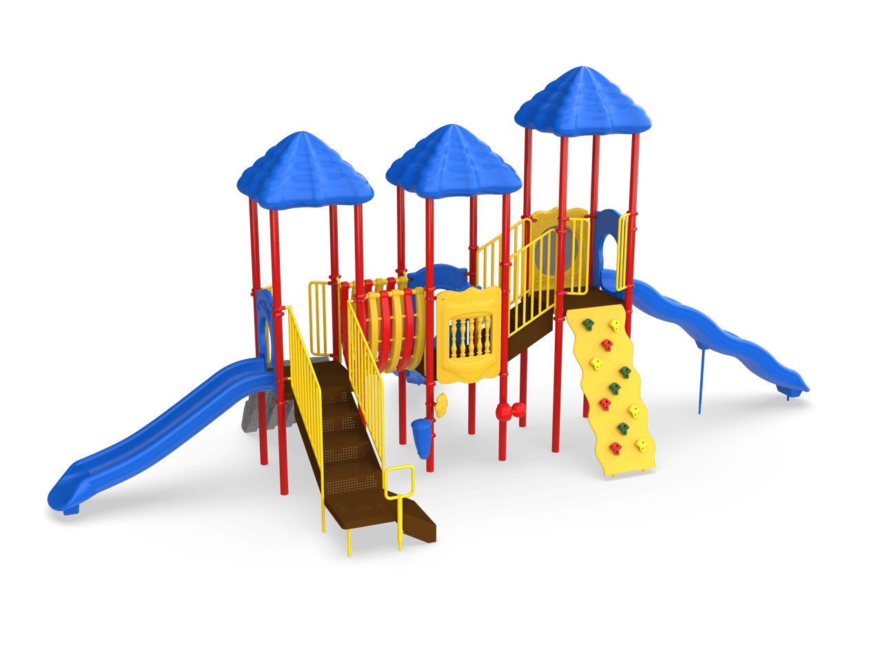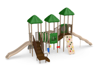 One of our most popular structures, Rainbow Lake offers a variety of play value for children ages 5-12. Children can ascend up the Vine Climber and traverse across the Bone Bridge before giving the Ships Wheel a spin and then zip down the exciting 6 Wave Slide. An alternate route includes scaling the Deluxe Rock Climb and sliding down the 4 Curved or Straight Slide. Ground level drums and rain wheel offer play experiences for children of all abilities.
