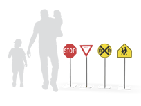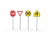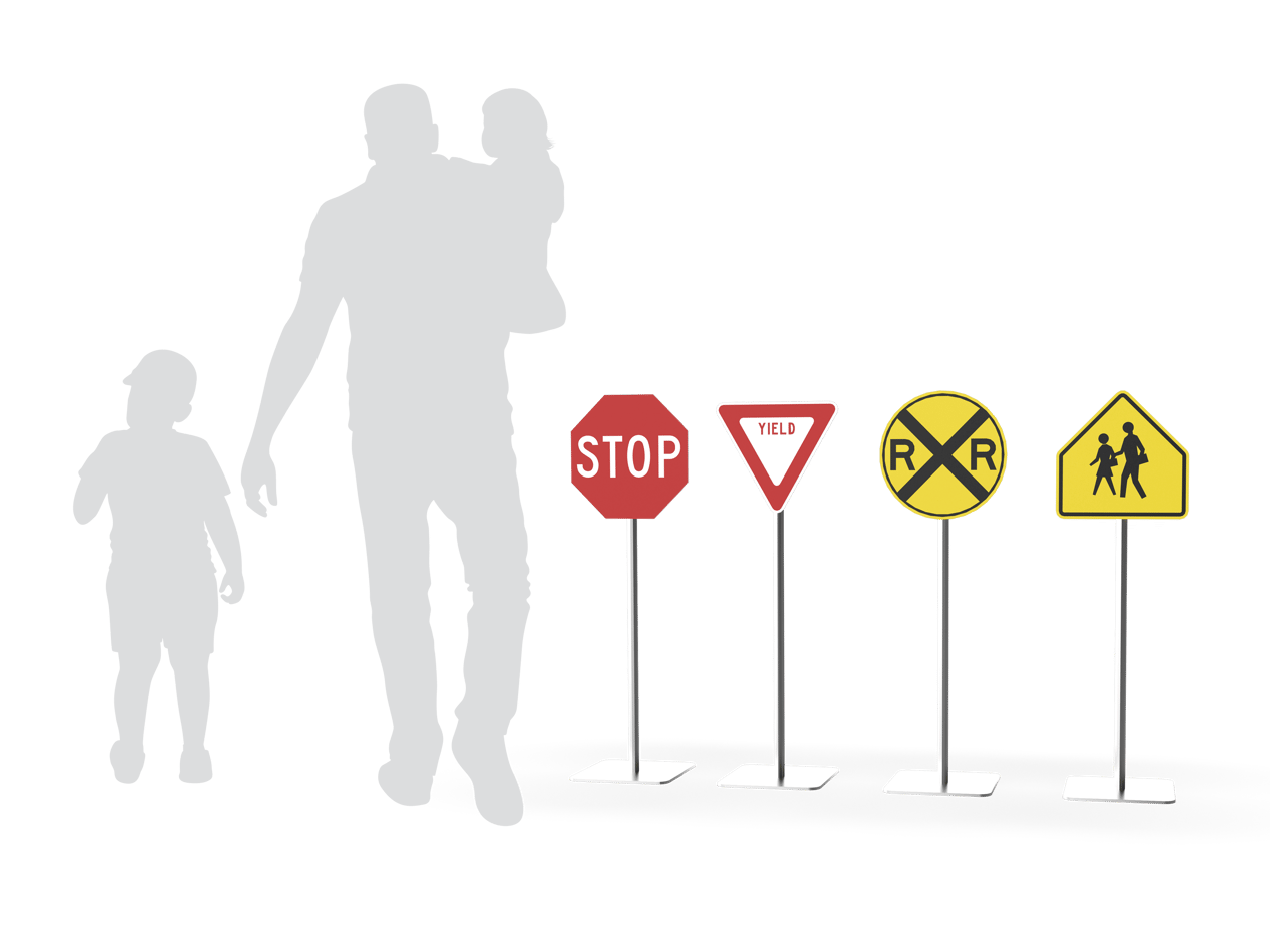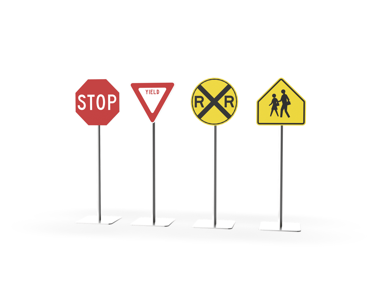 Set of 4 includes Stop, Yield, Railroad, and School Zone signs. Signs include a moveable base and can be rearranged throughout the pathway or brought indoors. Trike path must be placed outside of use zone. Trike Path sign height is 37-1/2.