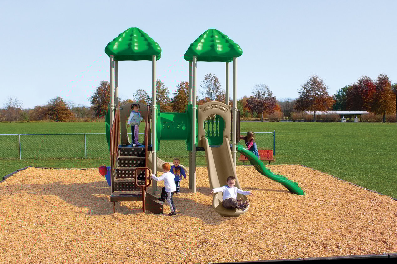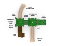 This compact structure is perfect for play areas with limited space, but doesn't compromise fun. Roofs over both decks and a cozy Crawl Tunnel offer children shade and place to relax after hours of fun. Ground-level musical components offer fun for children of all abilities.