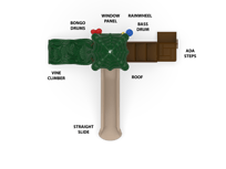 The most fun you'll find in a one deck structure! The South Fork boasts a challenging 4' Vine Climber and an exciting 4' Straight Slide. The Window Panel adds sensory play while giving caregivers increased visibility to the structure. Three ground level music components ensure that children of all abilities will enjoy this structure. Finally, the nature-themed roof helps keeps kids cool as they explore the South Fork.