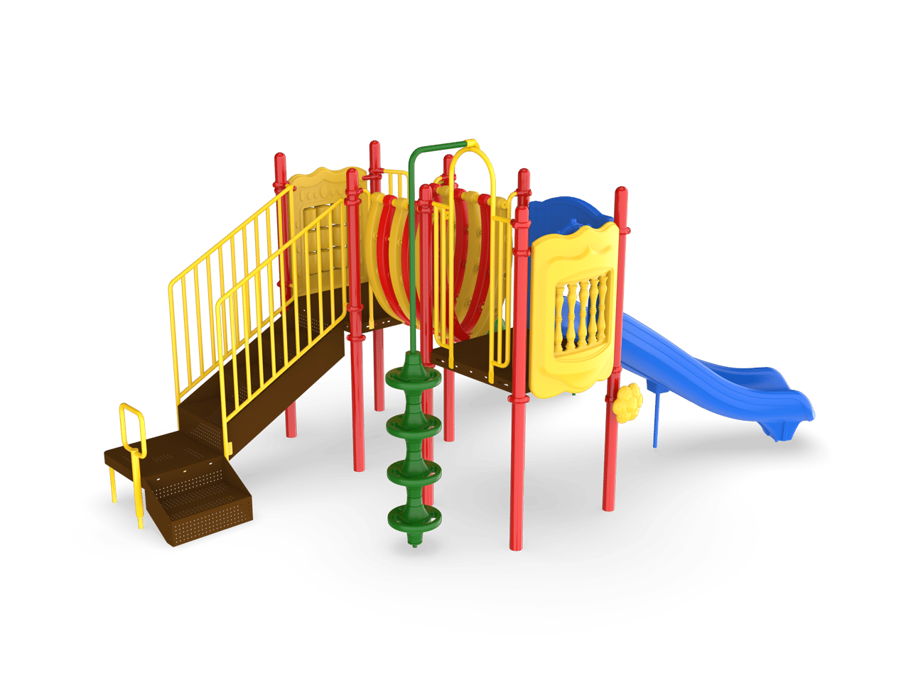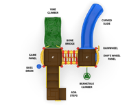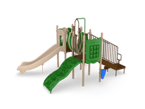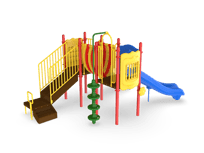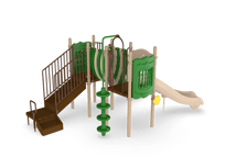 Nothing but smiles on the Sunnyside! The Sunnyside is a challenging and inviting play structure packed with diverse play components for children ages 2-5 or 5-12. Children can develop their gross motor skills and balance as they travel up the 4’ Vine Climber and across the Bone Bridge. The Ships Wheel Panel allows children to activate their imaginations as they become ship captains who navigate and socialize with friends. The 4’ Curved Slide offers an exhilarating sensory experience as children exit the structure and two ground-level music components offer creative play for children of all abilities. The Sunnyside meets ADA guidelines and is commercially compliant with ASTM & CSPC. A ground spike mounting kit is included with the structure, but an anchor bolt surface mount or in-ground mounting kit can be purchased separately.