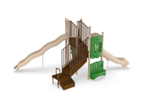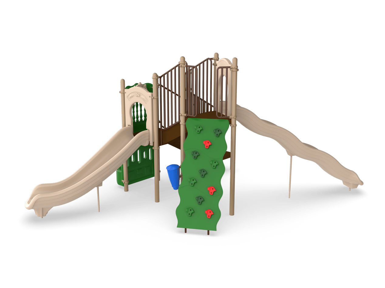 The Timber Glen is a perfect option for a multifamily complex or community park. It feature two slides at different heights to give children different sliding experiences. The Deluxe Rock Climber combines both upper and lower body strength while developing important motor skills. When children need a break, they can hang out on the Bench Panel or make music with the Bass Drum.