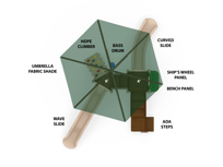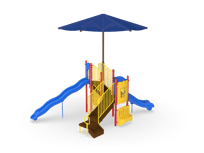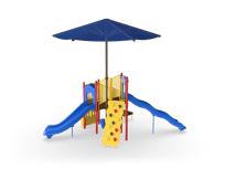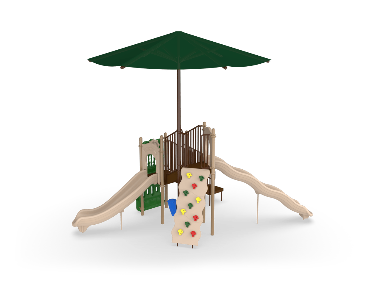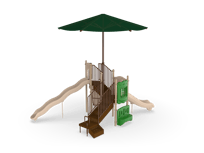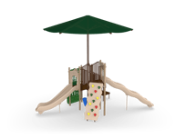 The Timber Glen with Shade is a perfect option for a multifamily complex or community park. It feature two slides at different heights to give children different sliding experiences. The Deluxe Rock Climber combines both upper and lower body strength while developing important motor skills. When children need a break, they can hang out on the Bench Panel or make music with the Bass Drum.